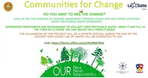 De La Salle Junior School in collaboration with other organisations raised awareness through clean ups and other activities about the amount of recyclable waste generated. The culmination of the project was a sports festival joining all forces together. All members of the communities collected recyclable waste, weighed it and the resulting amount of kilos was converted in KM of various physical activities such as swimming, sailing, running and cycling.
