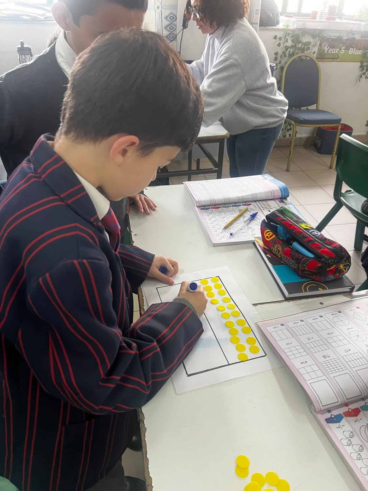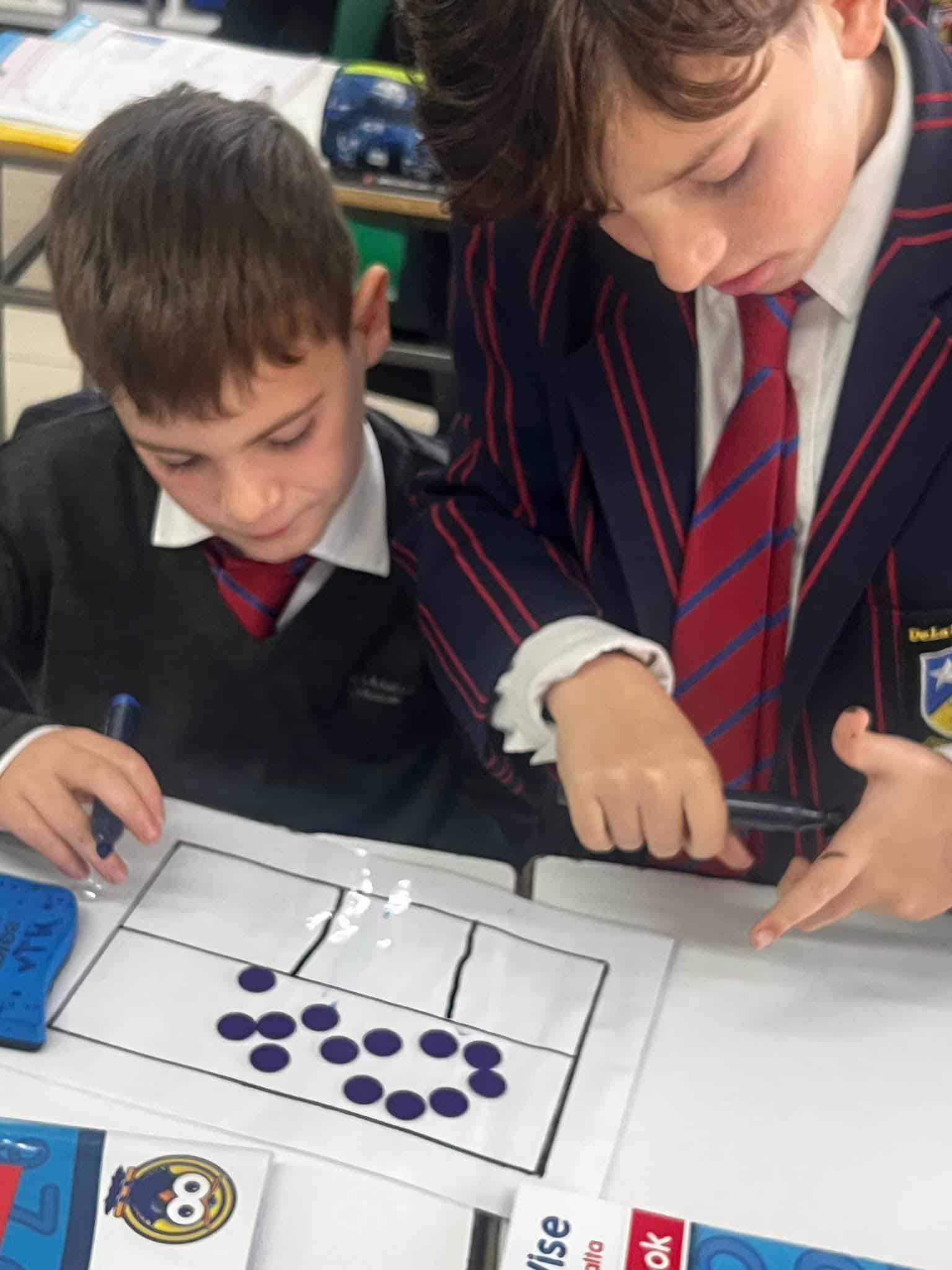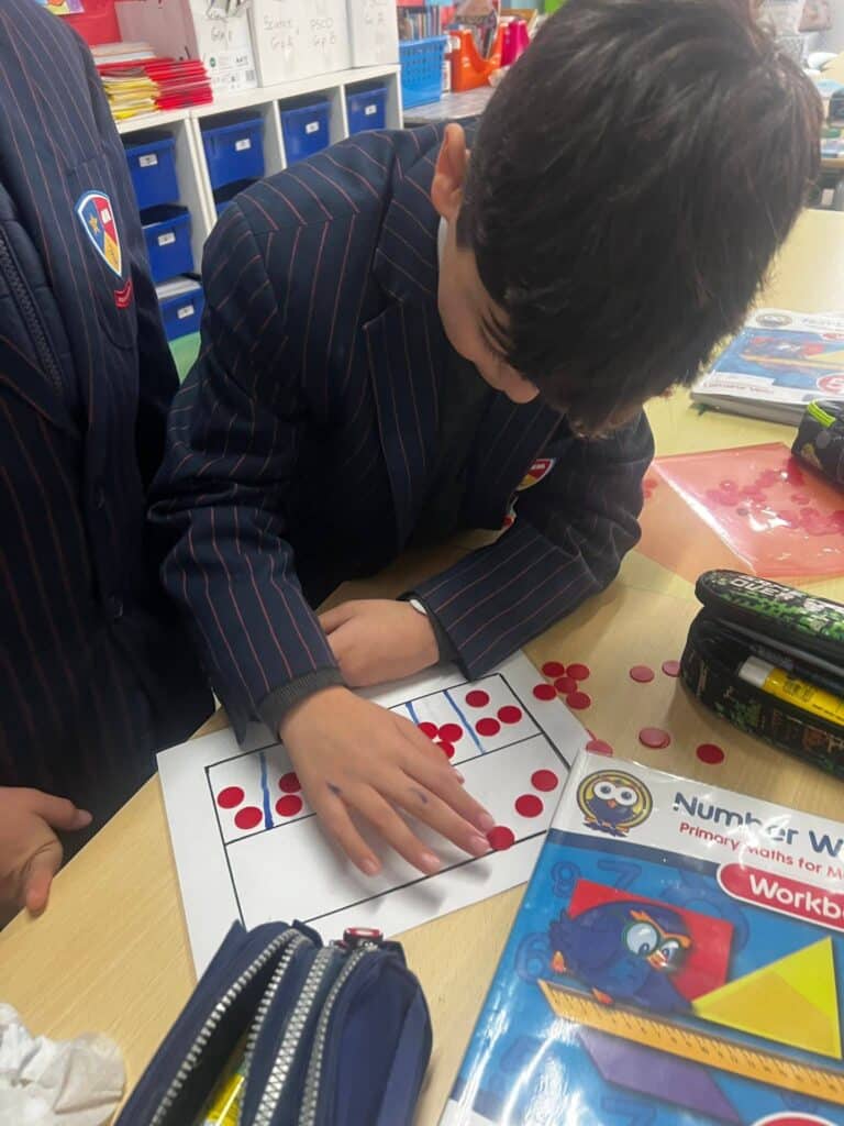 Year 5 Boys, learning about fractions of quantity - hands on group activity