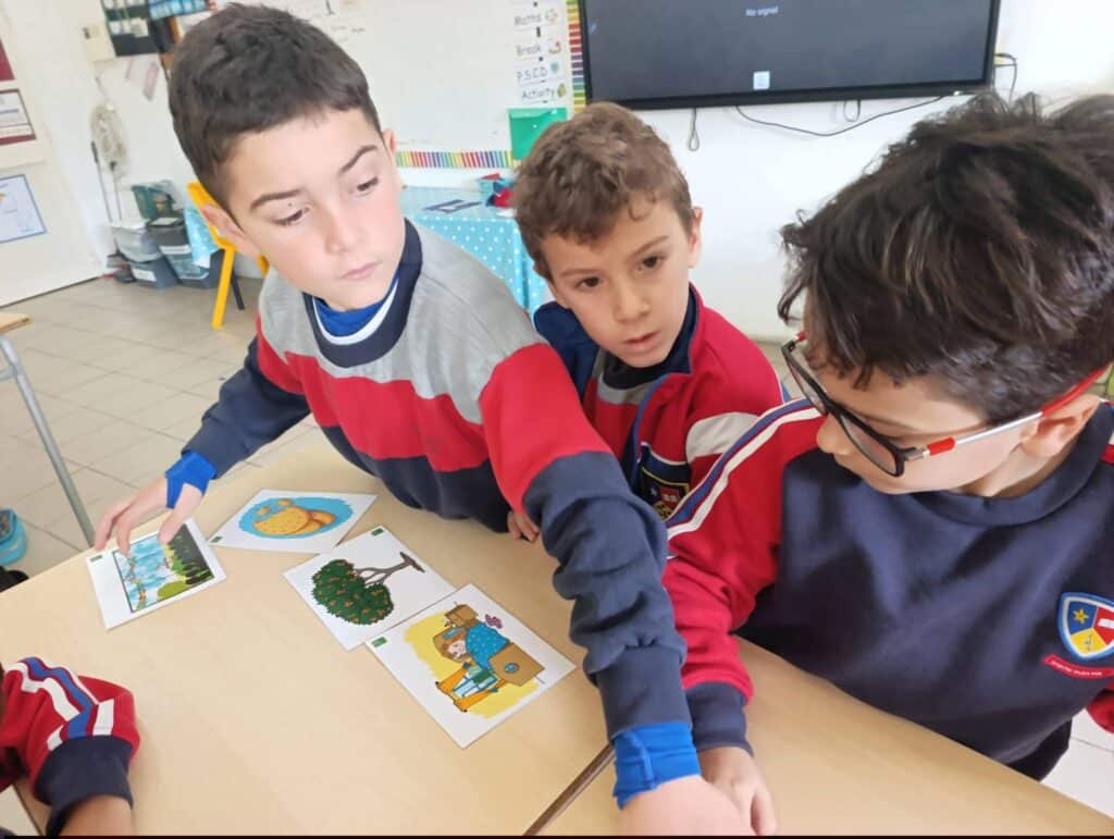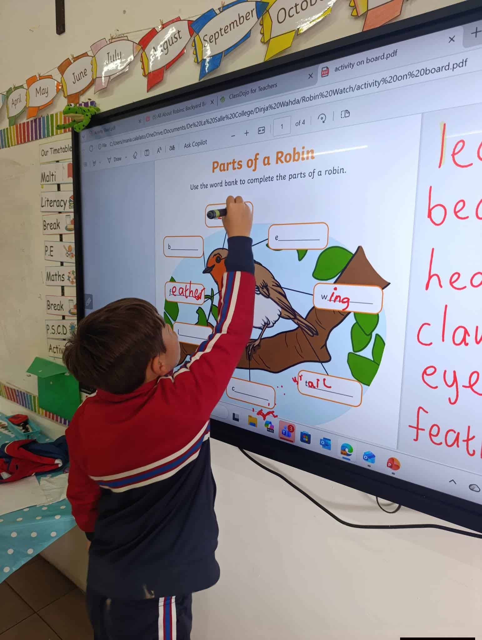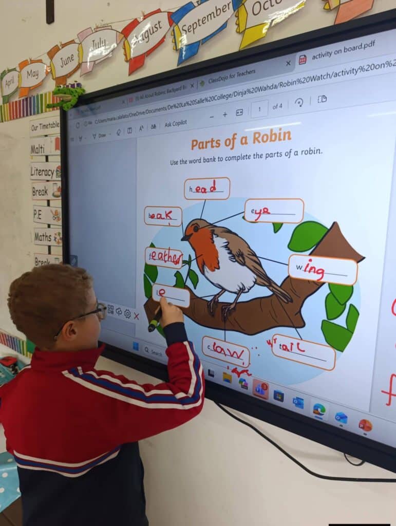 The students enjoyed listening to the story “The Happy Song” about a kind robin who helped a sick girl. They then sequenced the story using flashcards and watched a short clip to learn more about robins. The boys also labeled the parts of a robin.
